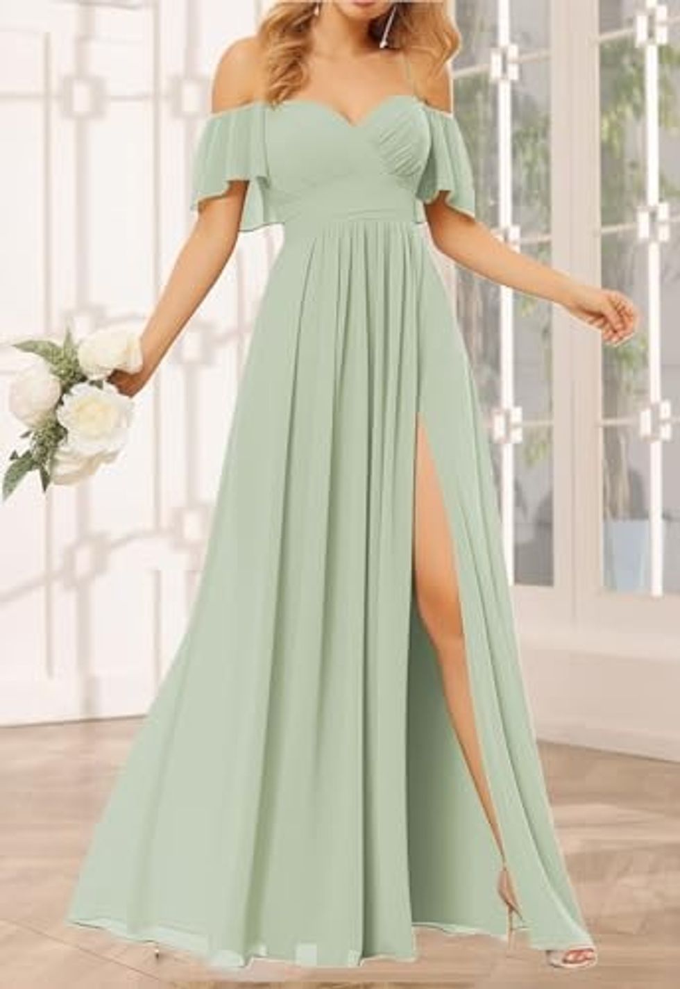 Step into soft power with the Ontoefy off-shoulder chiffon maxi. This pastel beauty floats as you move, with layered chiffon that trails like waves and a slit that adds just the right amount of drama. It’s beach goddess energy, made for sunset weddings or moonlit walks on damp sand.