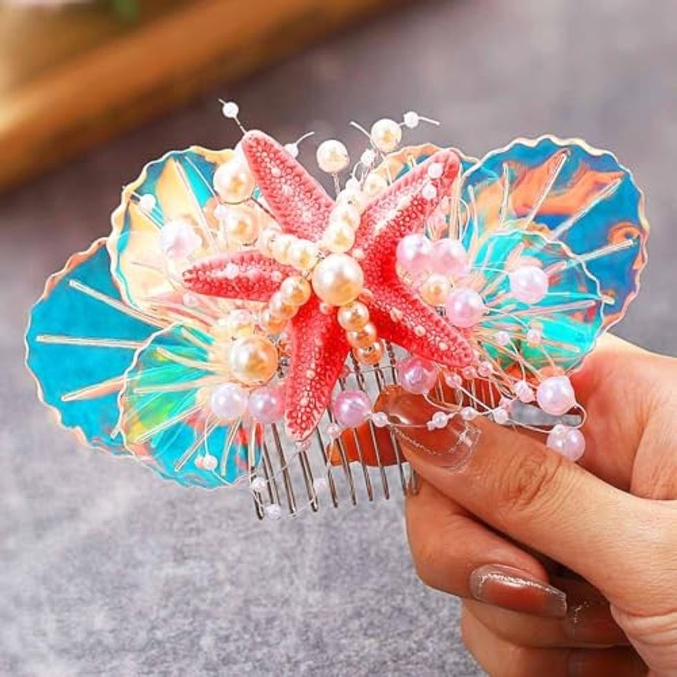 Add a touch of sea-spell to your hairstyle with the gold shell hair comb. Tiny pearls and a gold starfish make it perfect for a bridal bun, beach ceremony, or just pretending you're in a live-action fairy tale. It’s soft, glowy magic for your crown.