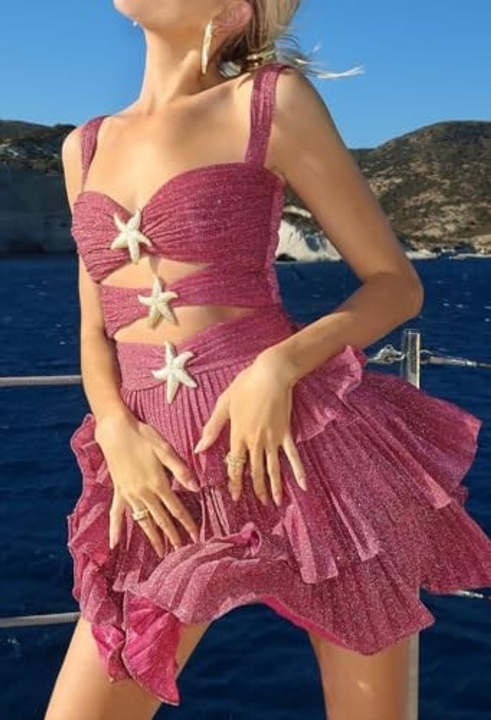 The women starfish mini dress is a siren’s party look made real. Covered in glinting sequin starfish and trimmed with wavy ruffles, this square-neck knit mini hugs like a wave and shines like sea glass. It’s the kind of dress that belongs on the dance floor and the shoreline.
