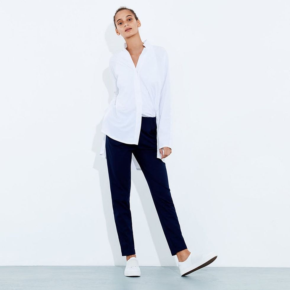 Dress pants for women often have a bad reputation for being dated and unflattering. ADAY has solved this problem with their Turn It Up Pant ($115). The adjustable, elastic waistband and soft, stretchy fabric make this more comfortable than any dress pant you own, but the tapered fit means you still get the tailored look of a cigarette pant. Cuff the hem for a more casual look and size up for a more slouchy fit. It’s currently offered only in blue, but a black version is in the works for the future.