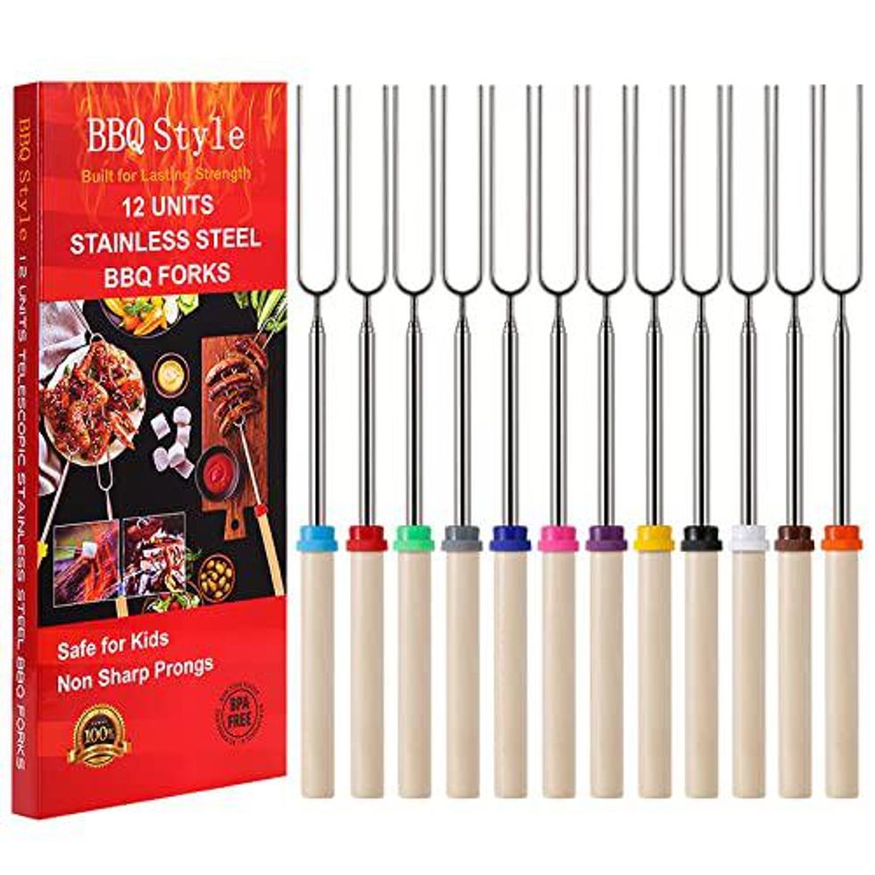 These BBQ Forks are a fun way to prepare delicious snacks together. You can use them to roast smores, marshmallows, sausages, hotdogs, and more. There are 12 bright and lively colored BBQ style marshmallow roasting sticks. The set comes with 12 sticks.