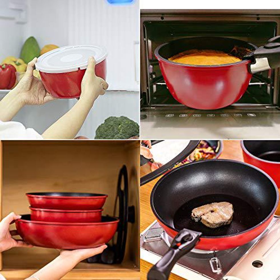 It is crazy how one college student caused such a hype for a pan set. This ROCKURWOK 8-Piece Pots and Pans Set is truly a space-saving legend. This non-stick pan set comes with a handle that is removable and is made out of thick aluminum. No more lost space! You can now stack everything easily without the hassle.
