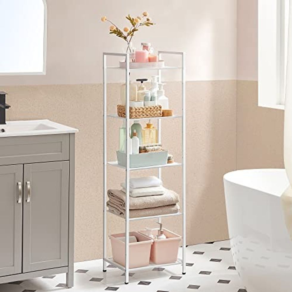 Add some extra storage and declutter your space with this five-tier rack that can be used in any setting, whether it's in the kitchen pantry, bathroom, or bedroom. The strong metal frame ensures durability, and the best part? You can adjust the shelves to your desired height, ensuring they suit your specific storage needs. Just choose from sleek black or white finishes to match your décor preferences!