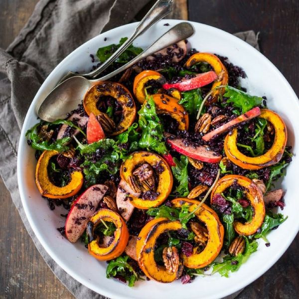 Roasted Pumpkin Salad: Be grateful for seasonal ingredients by showcasing them in a salad with a melange of roasted pumpkin, kale, wild rice, maple glazed pecans, apples, and an allspice vinaigrette. Feel free to add goat cheese if you want a little extra creaminess. (via Feasting at Home)