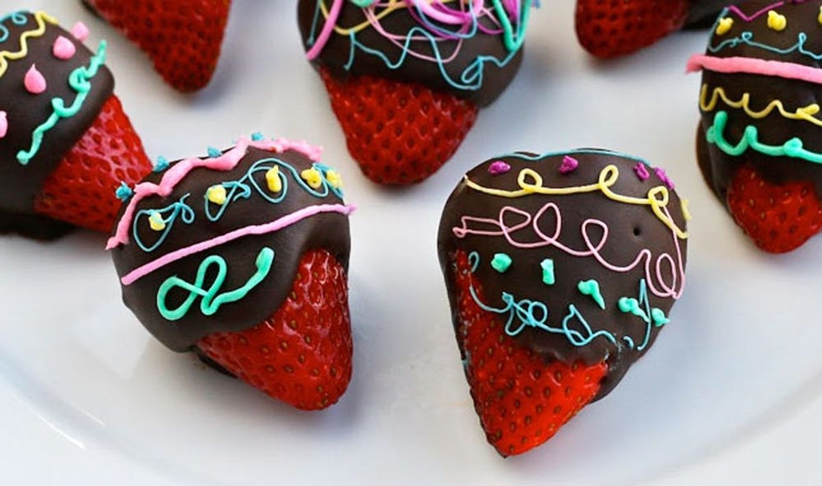 Allow to cool slightly and dip each strawberry at an angle into the chocolate, give a swift turn (so cream cheese doesn’t ooze out) and place on a pan lined with parchment paper. If you want to sprinkle with chopped nuts or coconut, you can do that now while the chocolate is still wet. However, we wanted to decorate ours like Easter eggs, so we just stuck them into the fridge to set.
