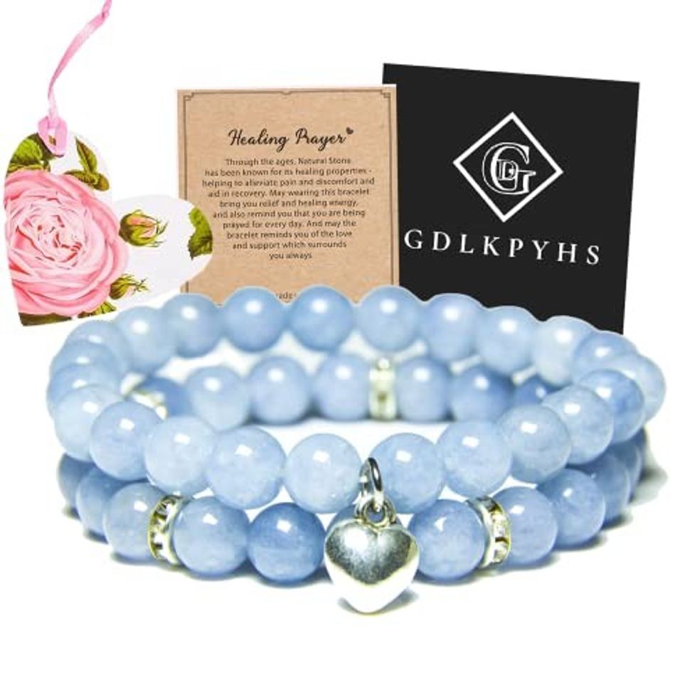"Aquamarine is the stone of love, symbolizing happiness, luck, and beauty," which makes it fitting for any bride to wear on her wedding day. The 8mm Natural Stone Healing Bracelet comes with a sweet Healing Prayer message card, envelope, and a heart-shaped card. The Healing Bracelet is available in several other stones, such as Amethyst, African Turquoise, and Green Jade.