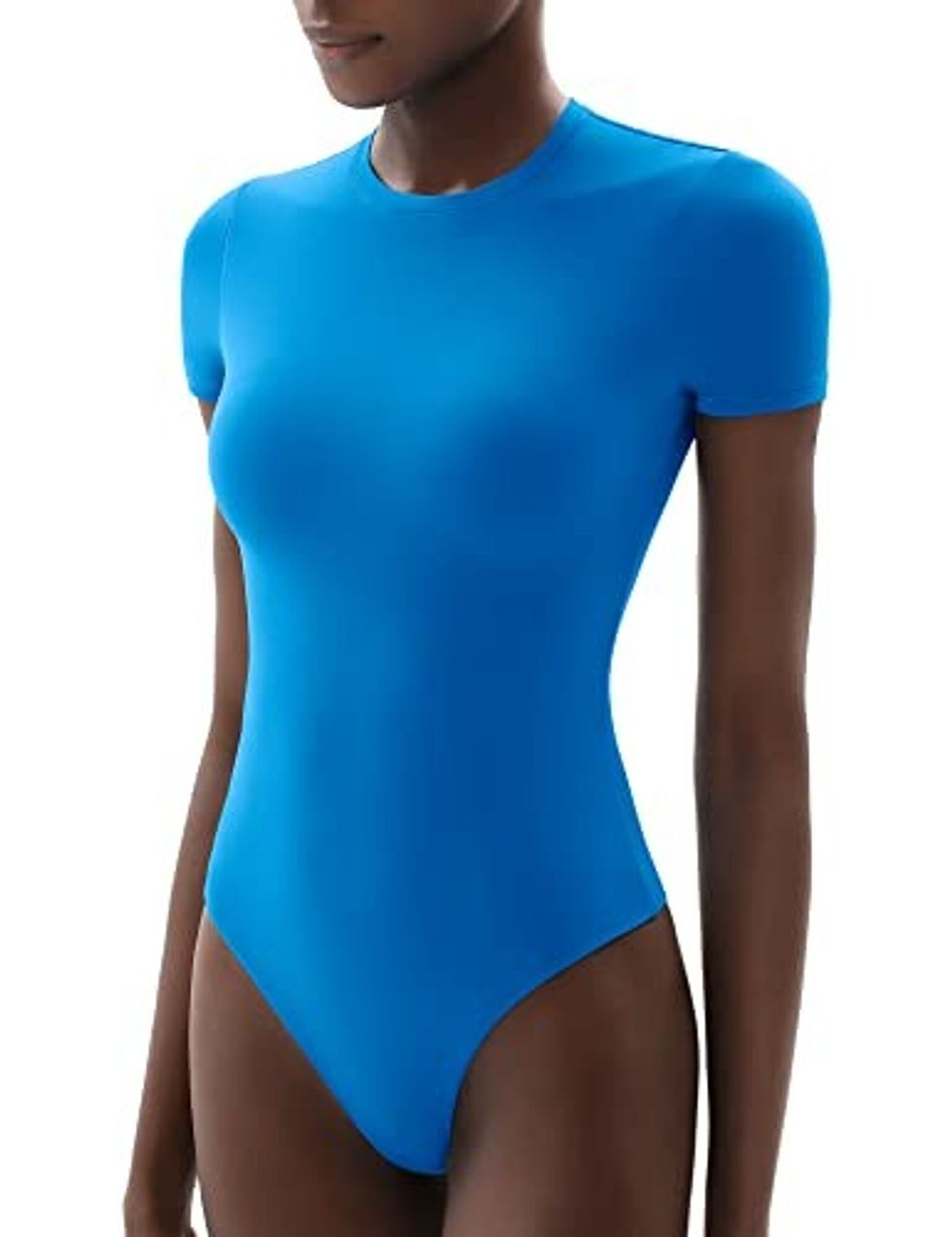 The Crew Neck Short Sleeve Bodysuit "is made with high-stretch, buttery soft fabric that hugs your body like a glove, and provides a second-skin feel and smoothing effect, making it the ultimate in comfort and style." The Bodysuit has double layers to avoid being see-through and has a snap closure on the crotch. Sizes range from X-Small to 3X-Large.