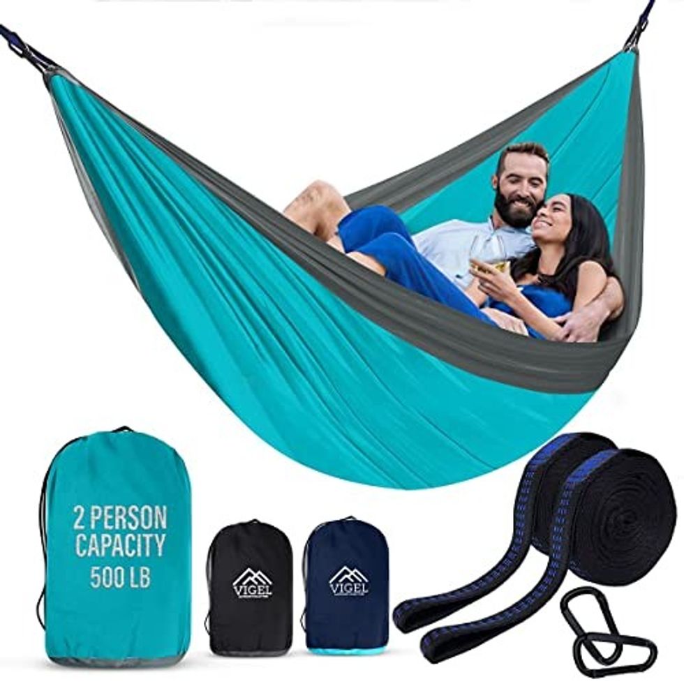 Vigel's Double Hammock is roomy enough for 2 people and has strong, durable straps with reinforced stitching for extra strength. The soft and comfortable Hammock is made of Nylon 210T Parachute Fabric. Weighing in at only 2 pounds, the "Hammock is designed to be compact and lightweight, making it easy to pack and take with you wherever you go."