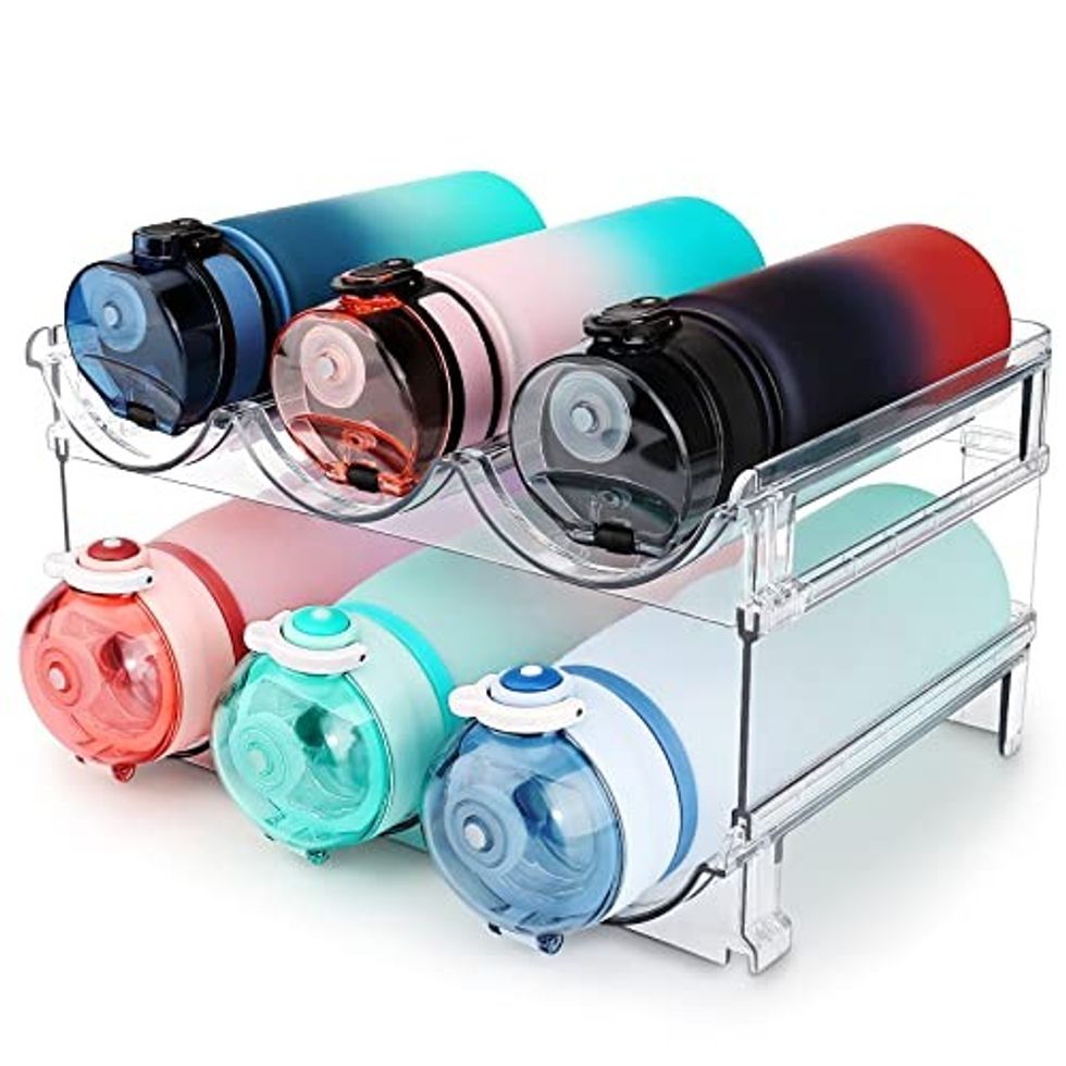 The highly-rated Storage Rack is suitable for use on the countertop and in the pantry or fridge. It's made of BPA-free, clear, and durable shatter-resistant plastic. The Stackable Water Bottle Storage Rack is offered as a 2, 3, or 4 Pack.