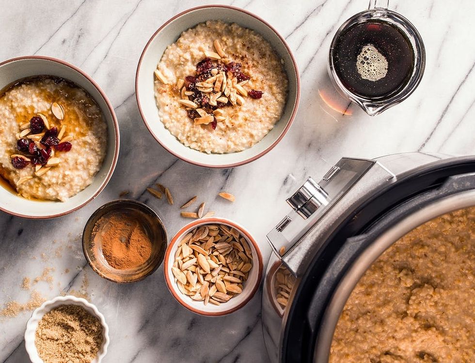 Why this recipe works: We love the chewy texture and fuller flavor of steel-cut oats, but careful monitoring for 40 minutes of stovetop simmering makes them a nonstarter on busy mornings. The multicooker made the process mostly hands-off and guaranteed creamy, hearty steel-cut oatmeal. We first toasted the oats in butter using the sauté function, which brought out their nutty flavor and took only a couple of minutes. Then, we locked on the lid and let the oats pressure or slow cook to tenderness. A bit of salt added to the cooking liquid seasoned them nicely. At the end of cooking, the oats were perfectly chewy, but our oatmeal was on the thin side and much too hot to eat. Letting the oatmeal sit for 10 minutes before serving solved both problems: The porridge thickened to a pleasantly thick consistency as it cooled. This oatmeal reheats well, so we could easily serve it again later in the week. Serve with your favorite toppings such as brown sugar, butter, maple syrup, cinnamon, dried fruit, and nuts.