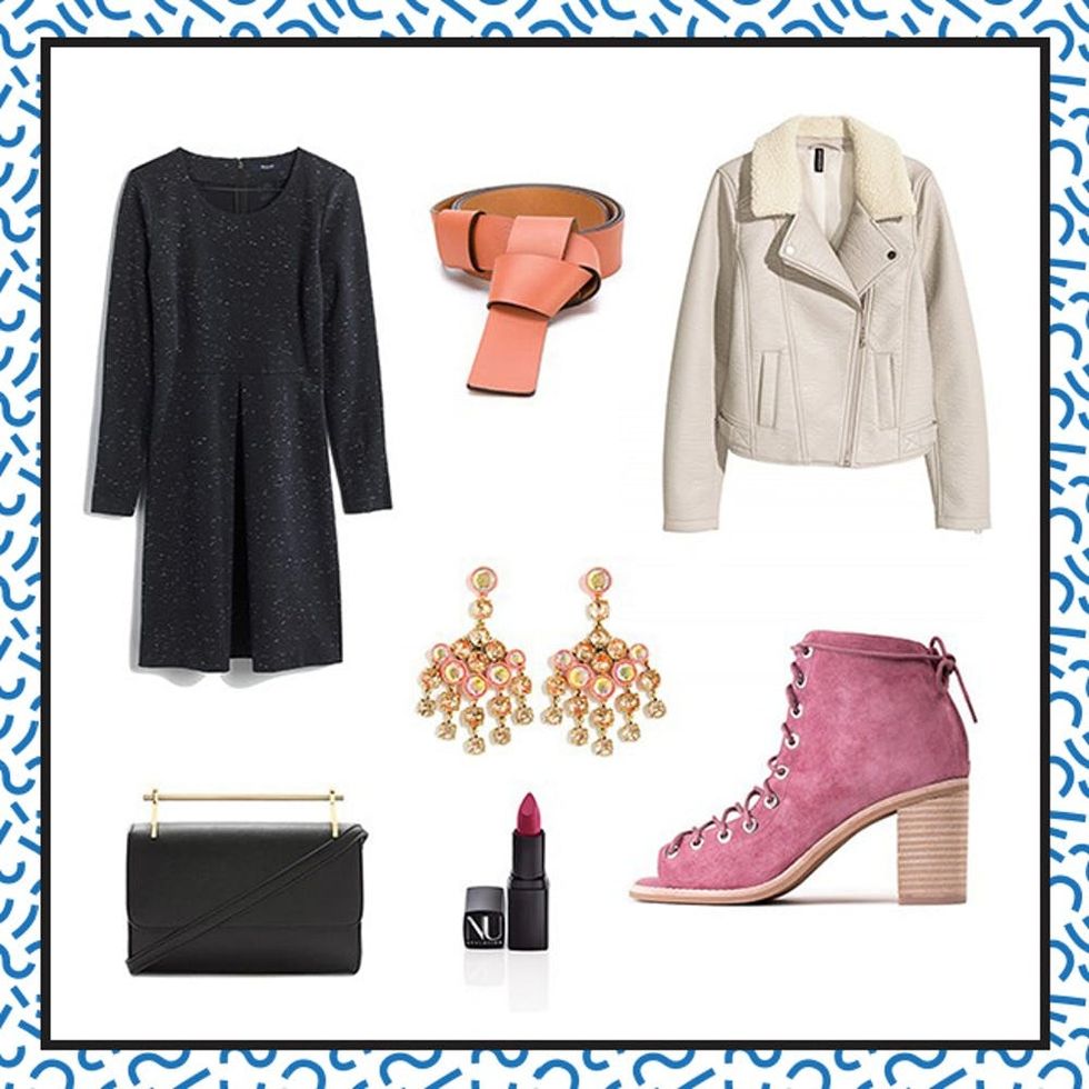 Madewell Concept Dress ($110) + H&M Biker Jacket With Pile Collar ($60), Dorothee Schumacher Knotted Belt Buckle ($169), Jeffrey Campbell Cors Boots ($165), J.Crew Crystal Chandelier Earrings ($78), Forever21 Faux Leather Crossbody ($25), Nu Evolution Lipstick ($30)