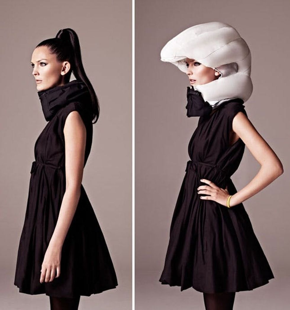 Developed as a collar for bicyclists, the Hövding is ergonomic, practical, complies with all standard safety requirements, and happens to blend in with just about any outfit. Instead of a bulky helmet, it’s similar to an airbag shaped like a hood, made to surround and project the bicyclist’s head. It protects you and your do. ;)