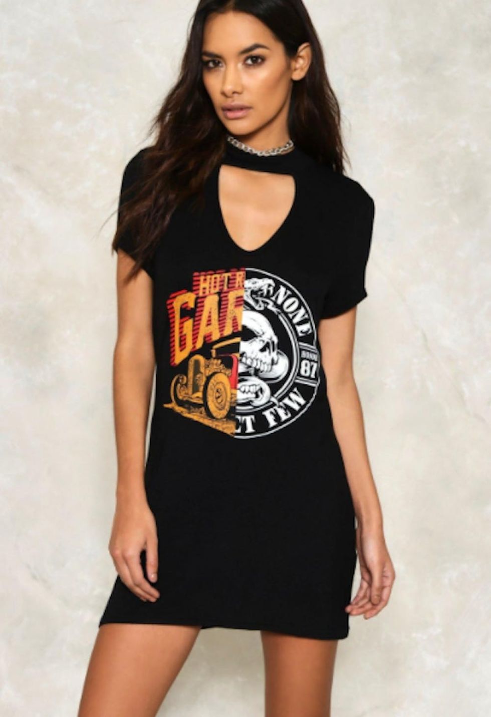 While the style of the Kayla Graphic Shirt dress (also $36) I received was kinda similar to the one I had actually ordered, I wasn’t digging the wild cutout at the shoulder that appeared like it would make wearing a bra next to impossible. I could easily discern how the mix-up had occurred, as the tag on the dress in the bag I clutched bore the name of the original item I had wanted — the Hazel Choker Tee — but the item was most definitely not what I had expected.