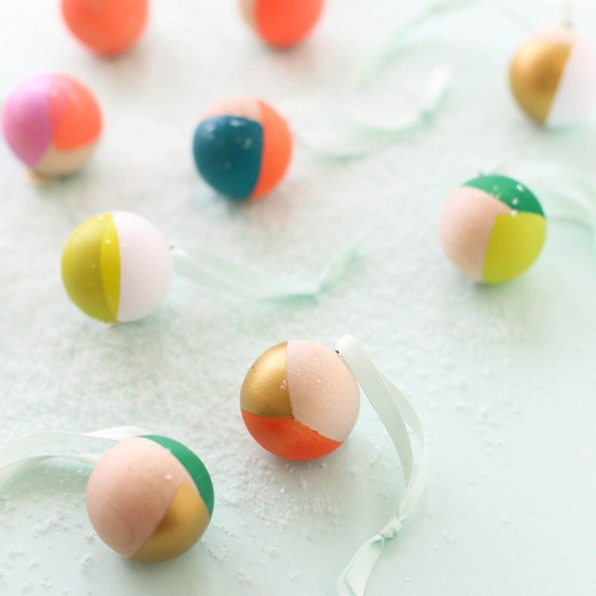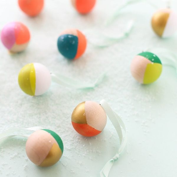 17. Dip Dyed DIY Ornaments: Give Anthro’s dipped ornaments ($38) a more modern look by using wooden balls and a palette of neons and gold. (via Say Yes)