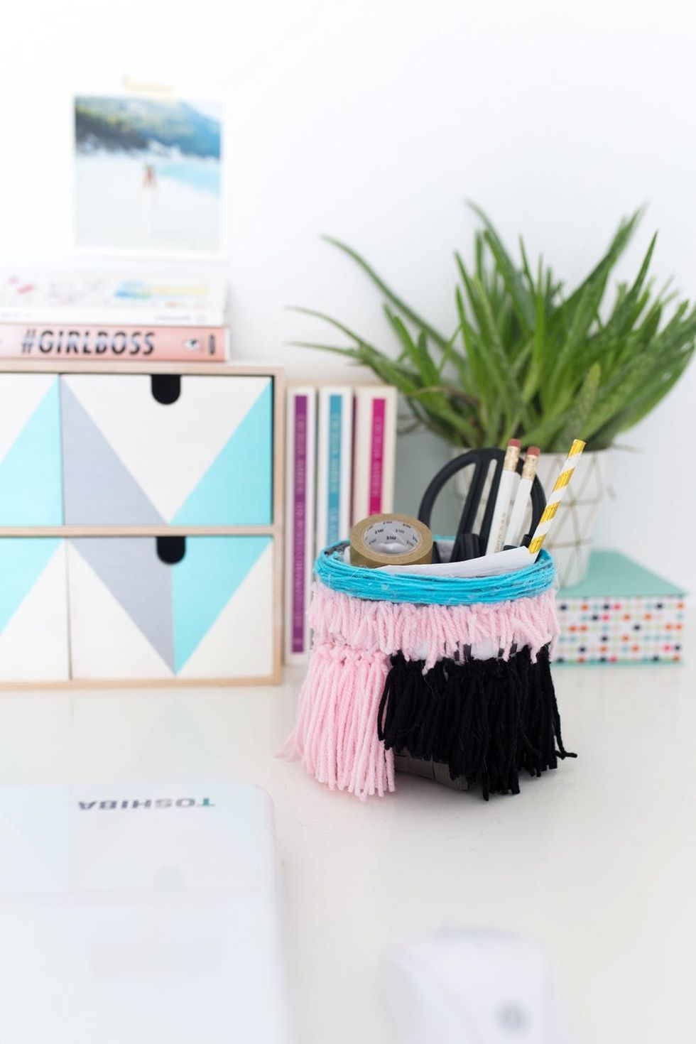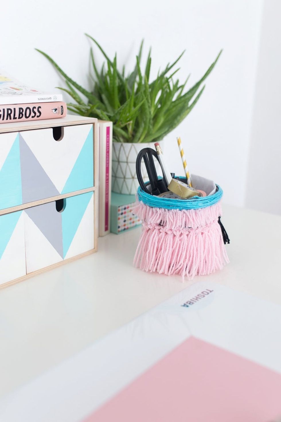 It’s that time of year again. No matter how much we would love to avoid spring cleaning, we just can’t ignore our messy desk forever. So let’s take a deep breath, download a cleaning checklist printable, and take the opportunity to try a brand new DIY project. This beauty, inspired by the Anthropologie Tasseled Pera Basket ($52), is the perfect organizer for pencils, washi tape, and everything you have on your desk.