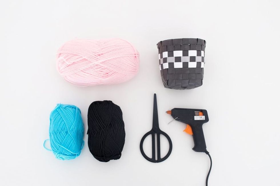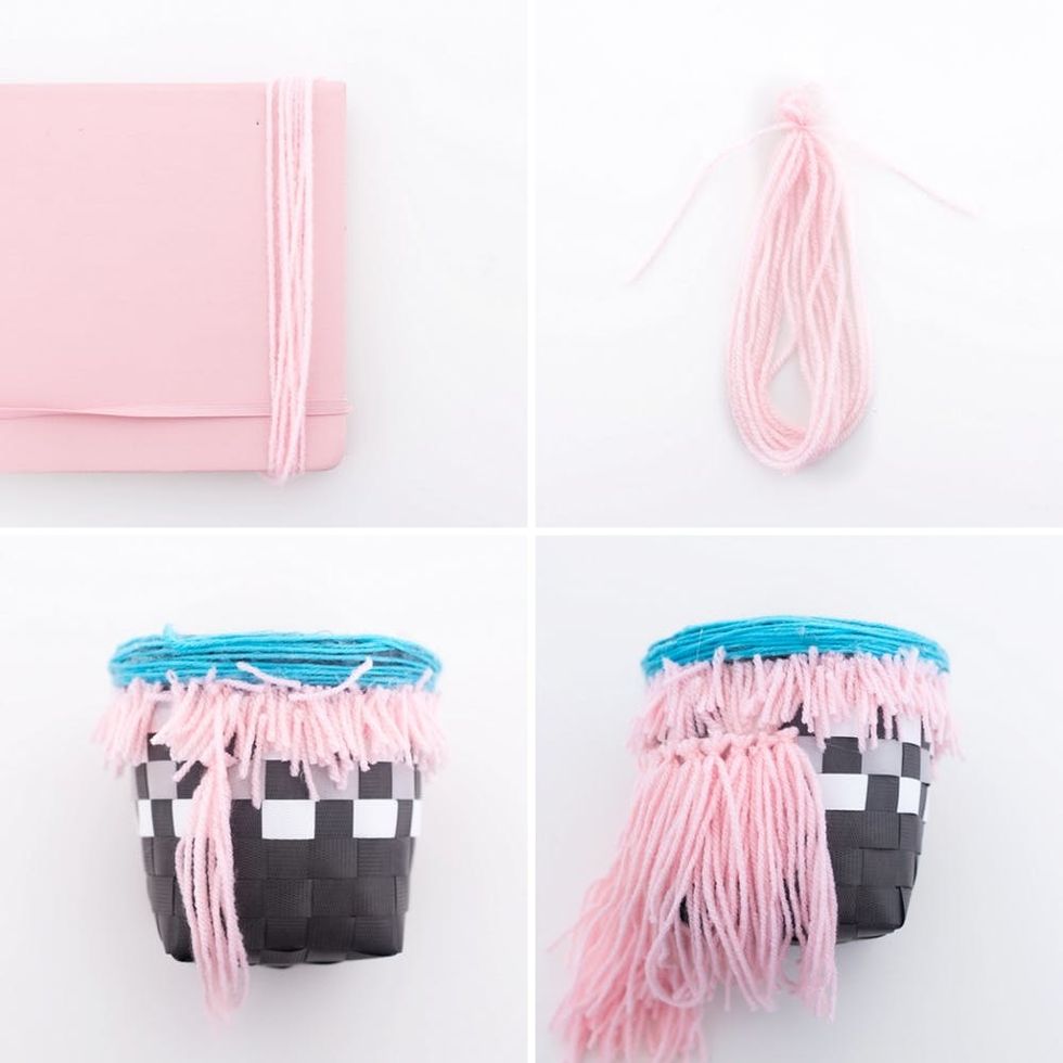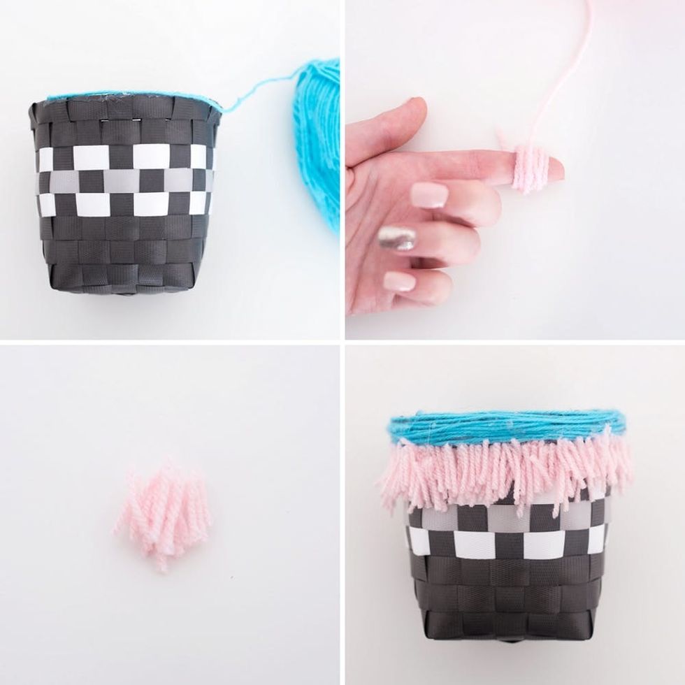 Wrap the pink yarn around a notebook (or anything that is more or less as tall as your basket) five times. Tie a knot to create the head of the tassel, and then cut the bottom. Use the hot glue to glue the first pink tassel and repeat with more tassels.