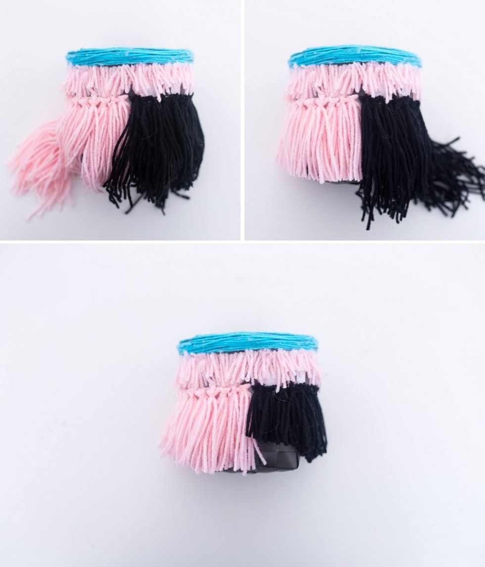 9. Repeat steps 5-8 to create more tassels, but this time use black yarn. Glue the black tassels in place and let everything completely cool.