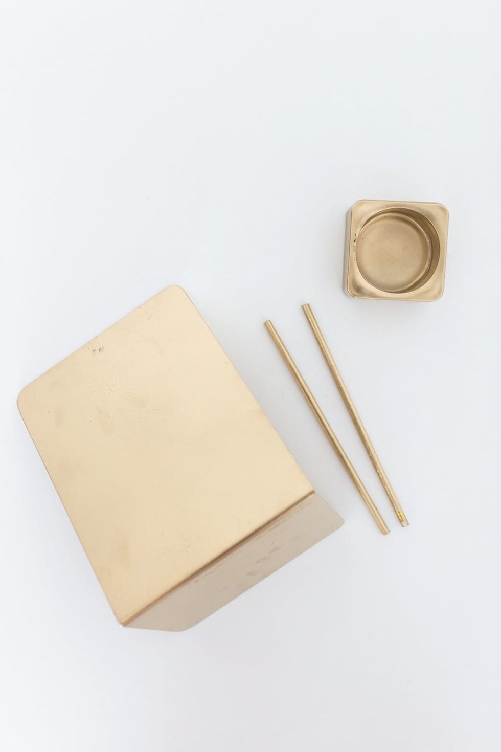 After protecting your surface, spray paint your bookend. Shake it for a while and paint a thin layer with your gold shade. Let dry and repeat with a second coat if you need to. Next paint the candle dish and straws (or even better, copper pipes) as well.