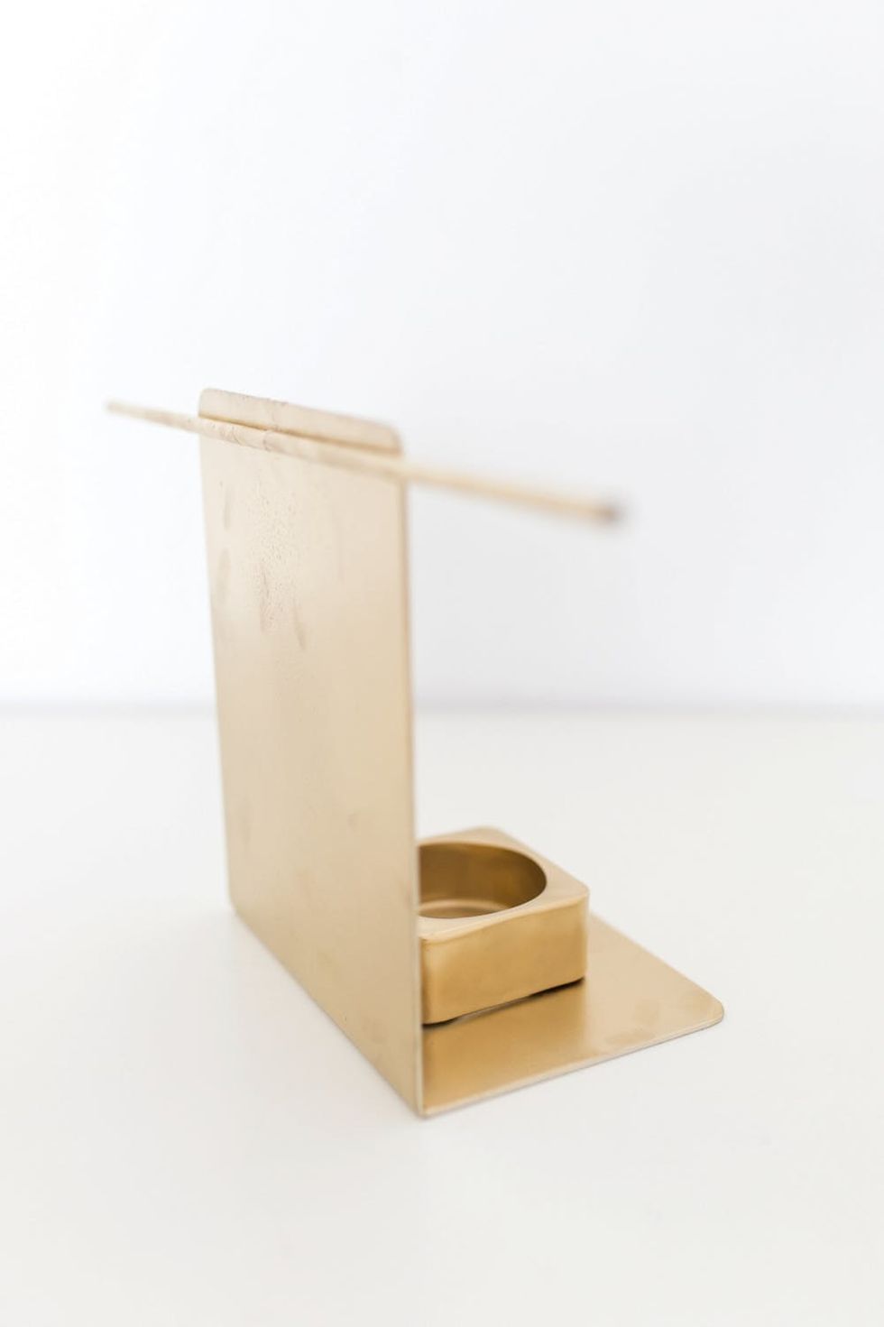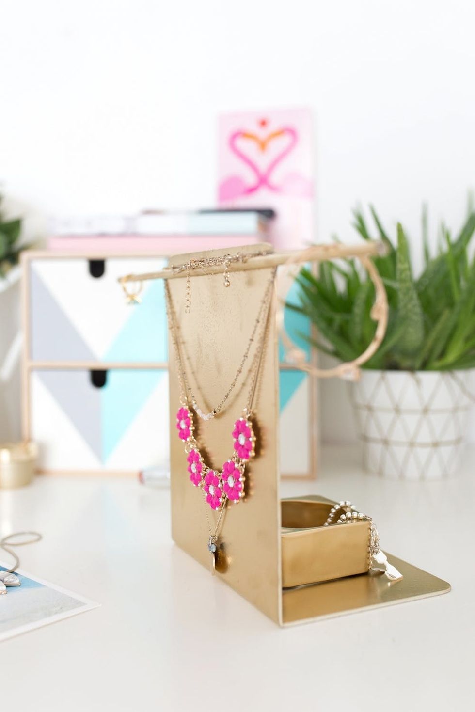 It’s no secret that here at Brit + Co, our favorite way to accessorize is with jewelry. And since we’re always on the hunt for new sparkly pieces to wear, from handmade rope necklaces to gemstone rings, we’re also constantly looking for cute and clever ways to organize our treasured bling. So today we’re getting inspired by this Anthropologie Metronome Jewelry Stand ($28) to create a gorgeous metallic display in just three steps ;)