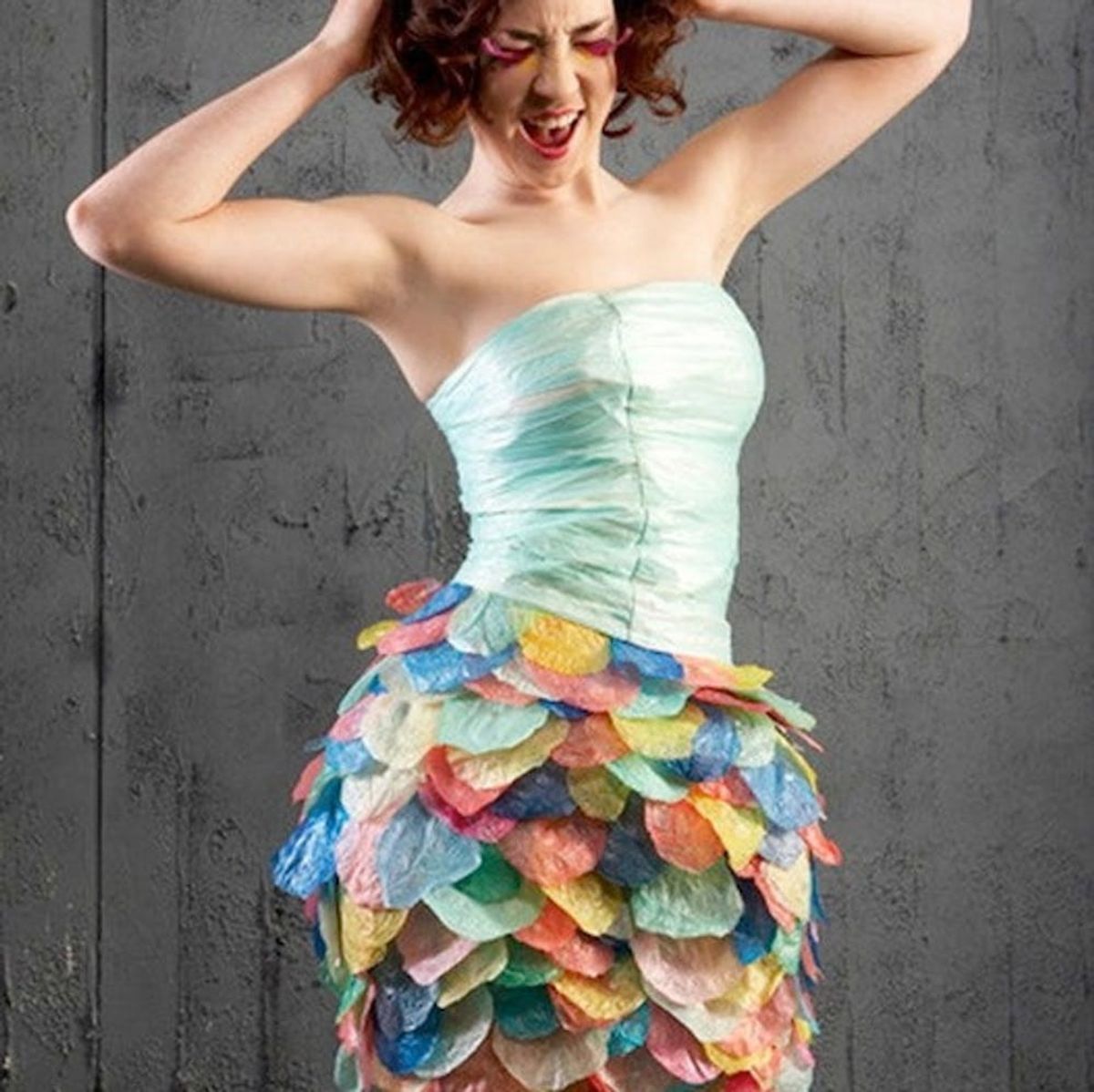 9. Recycled Materials Dress: Any sort of recycled material can be used to make a gorgeous ABC look. In this case, multi-colored plastic bags do the trick, creating a lovely dress that makes us feel oh so ’80s. (via Chictopia)