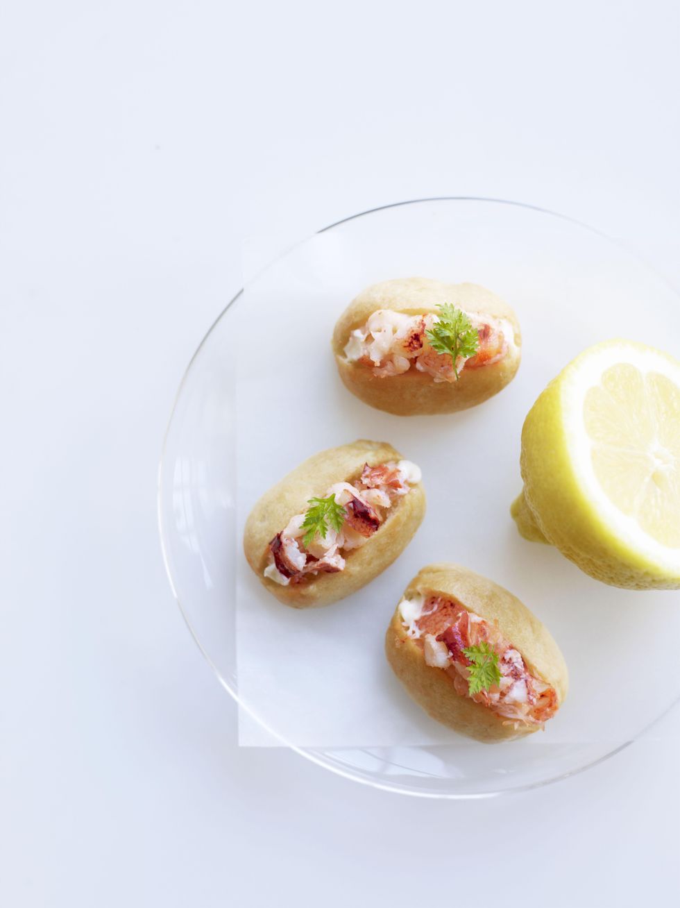 1. Use a serrated knife to slice the rolls at a 45-degree angle, starting at the top right corner and slicing three-quarters of the way through the roll. Place a small amount of lobster filling in each roll, finish with a chervil leaf, and serve with a lemon wedge.