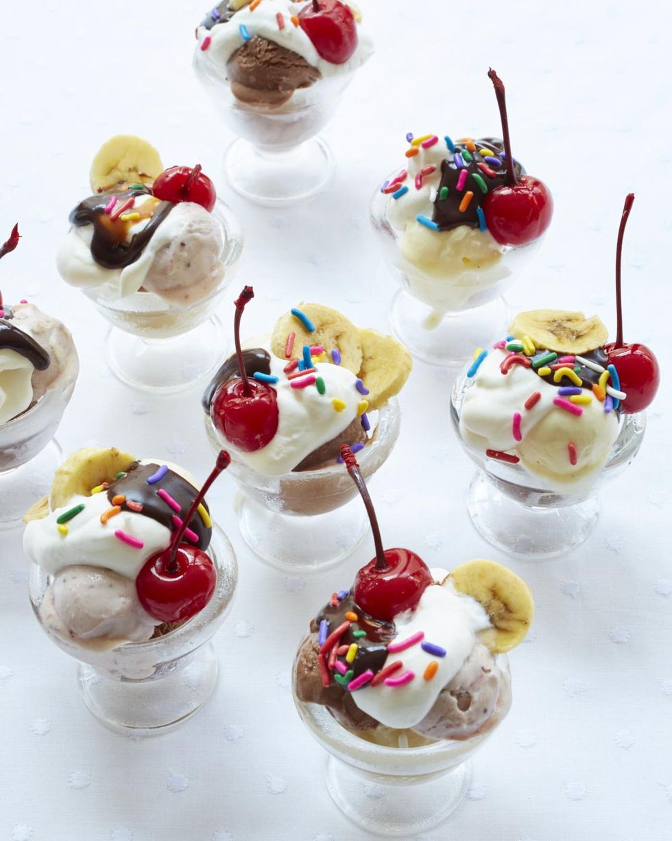 1. Place one scoop of each flavor of ice cream in a mini sundae dish. Place a banana slice in between scoops. Drizzle each sundae with chocolate sauce and top with whipped cream, sprinkles, and a cherry.