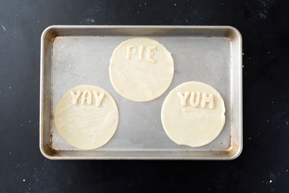 Use a soup bowl to cut out smaller circles from the pre-made pie crust. Create cute phrases on the tops of the circles using small alphabet letters. Score the pie crust and use egg whites to help attach the letters.
