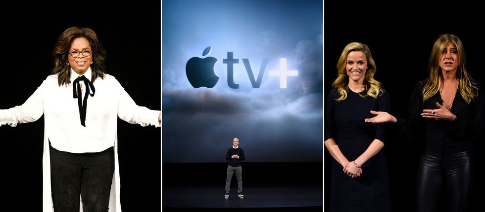 What can I watch on Apple TV+? So far, only a small selection of the streaming service's programming has been revealed, but Apple said that over 20 original titles are in the works (including Reese Witherspoon and Jennifer Aniston's much-anticipated series The Morning Show). According to The Hollywood Reporter, Apple appears to be making an initial play for some pull in the TV awards space, having invited a handful of members of the Hollywood Foreign Press Association — who vote for the Golden Globes — to Monday's event. (Photo via Michael Short/Getty Images)