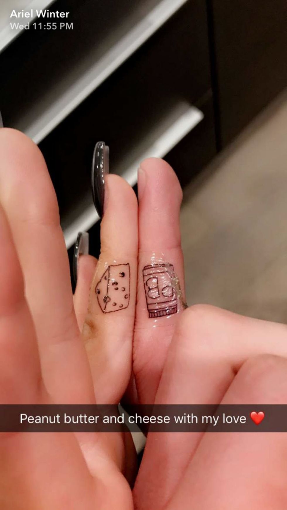 They also debuted a pair of finger tats in the shape of a peanut butter jar and a block of cheese, their nicknames for one another. “Peanut butter and cheese with my love,” Winter captioned with pic with a heart emoji. *Melt*