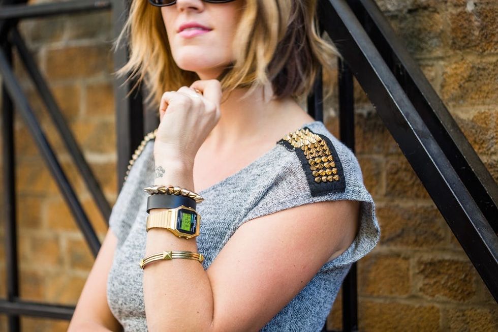 Get the look: Gold ’80s Retro Timex Classic Watch ($45); DIY Studded Bangles.