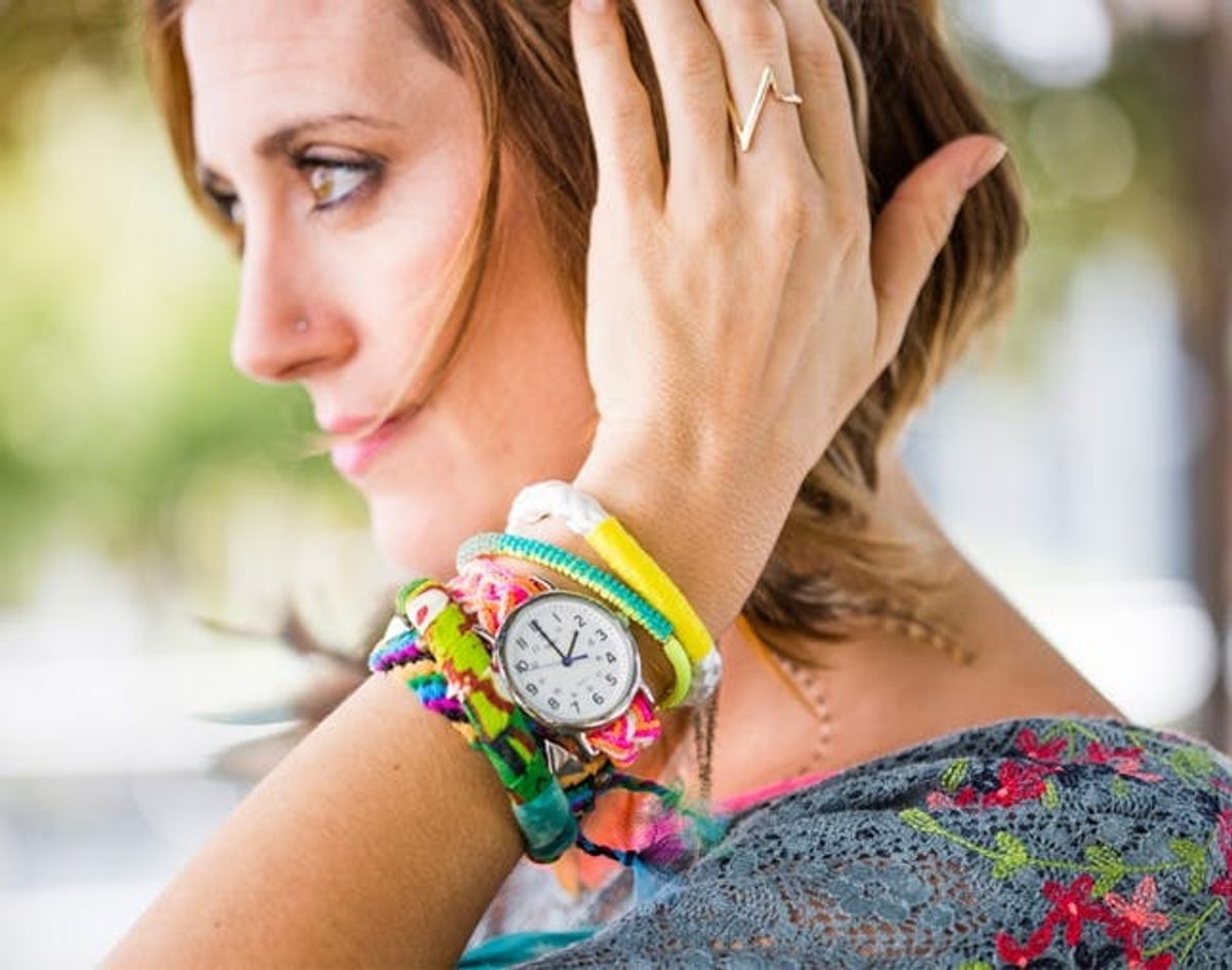 This boho babe isn’t afraid to mix every texture and color under the sun. Friendship bracelet? Check. Beaded bangle? Check. Stylish timepiece? You got it.