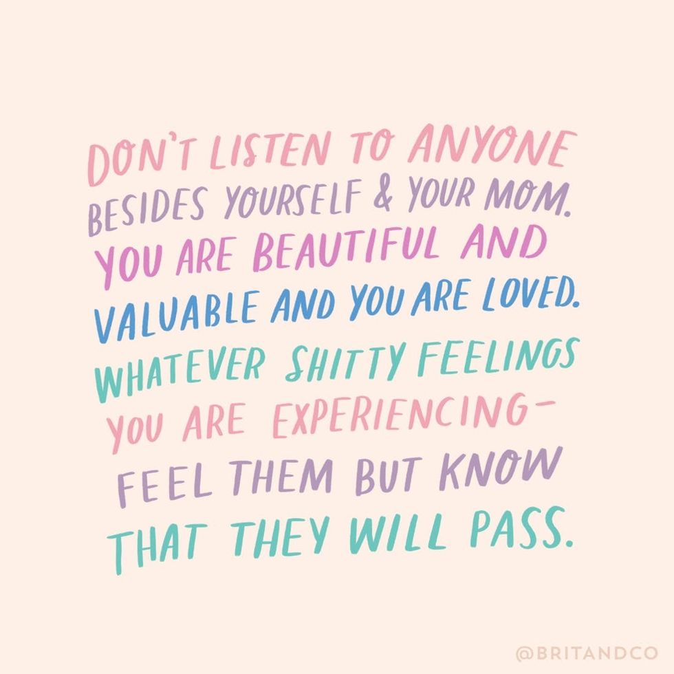 AH: This is striking a bone! Just let it go. Don’t listen to anyone besides yourself and your mom. You are beautiful and valuable and you are loved. Whatever shitty feelings you are experiencing — feel them but know that they will pass!