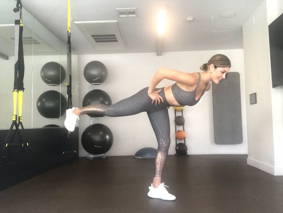 - Finally, hinge forward as you did in the first part of the move, and pulse your lifted back leg up, using your glute muscle to lift, 15 times.
