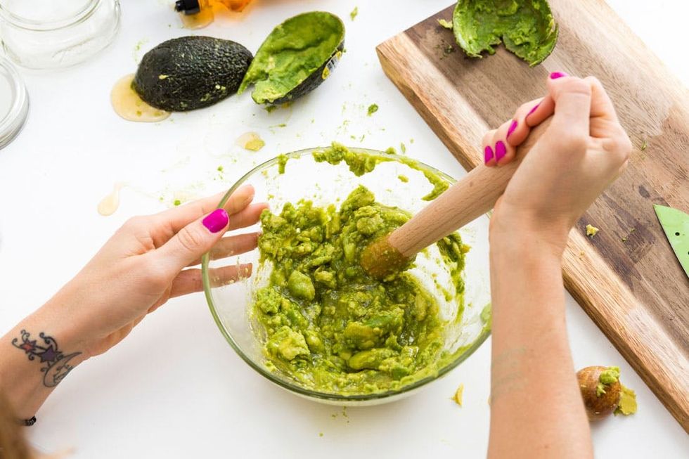 Cut 2-3 avocados in half, depending on how much you want to make. Use your hands to scoop the avocado out and into a bowl. Then use your hands again to mash it up.
