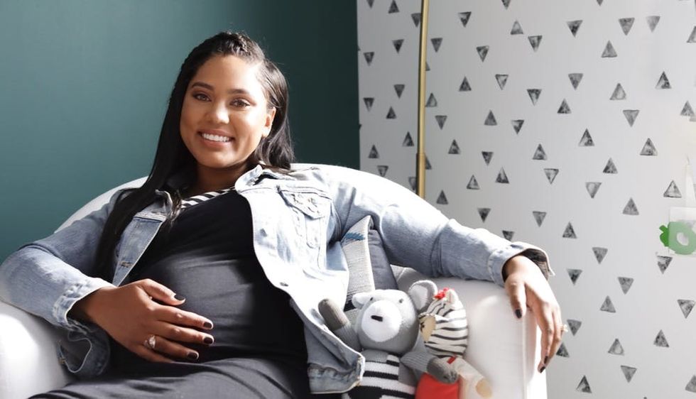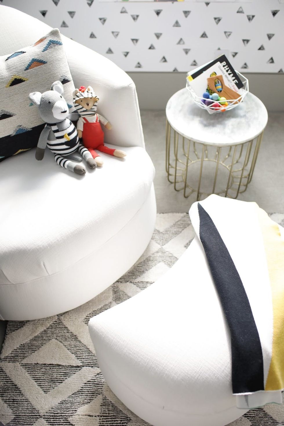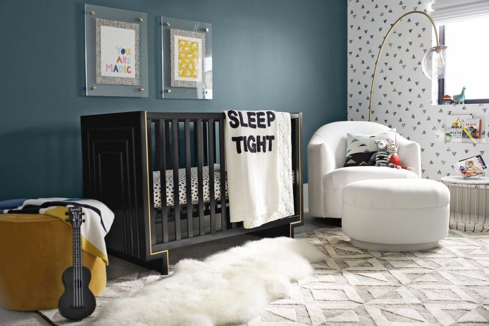 Pottery Barn’s latest collection offers five distinct styles: Glam Modern, Hip Modern, Natural Modern, Casual Modern, and Minimal Modern. Curry went off-book and decided to personalize baby Canon’s room even further by combining elements from multiple style families for a totally enviable mix. The new mom chose the Glam collection’s Black Art Deco Crib ($999) and then echoed the geometric motif by peppering in triangle-print pieces like the Izzy Rug ($399+) from the Hip Modern collection.