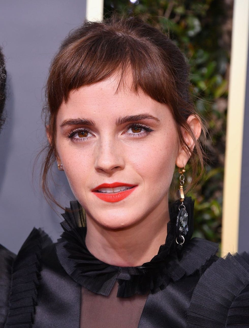 2. Emma Watson: Baby bangs don’t have to be blunt — just ask Watson. The unkempt tips kept her ‘do feeling trendy and casual, and juxtaposed the clean vibe of her black outfit. (Photo via George Pimentel/Getty)