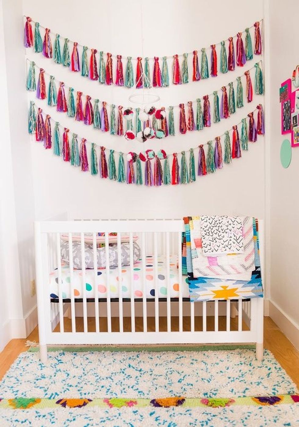 9. Mixed Material Tassel Garland: Mixing yarn and nonfrayed fabric to DIY this garland makes for a cozy backdrop to your crib. (via Brit + Co)