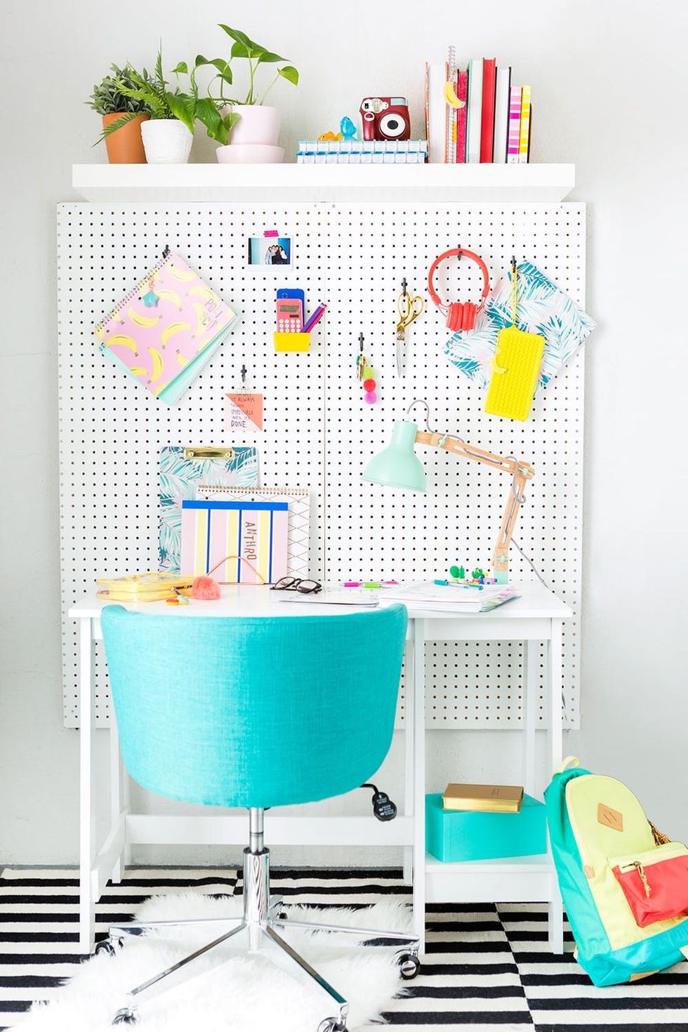 Fact of life: Dorm rooms are inevitably small. But just because your room isn’t exactly ROOMY doesn’t mean it can’t be a productive spot for your study jams. We’re all about maximizing vertical space *and* creating a comfortable workspace by way of smart storage — AKA a big pegboard and wall hooks galore. Instead of cluttering your desk, hang notebooks, photos, pencil pouches, and your other essentials on hooks.