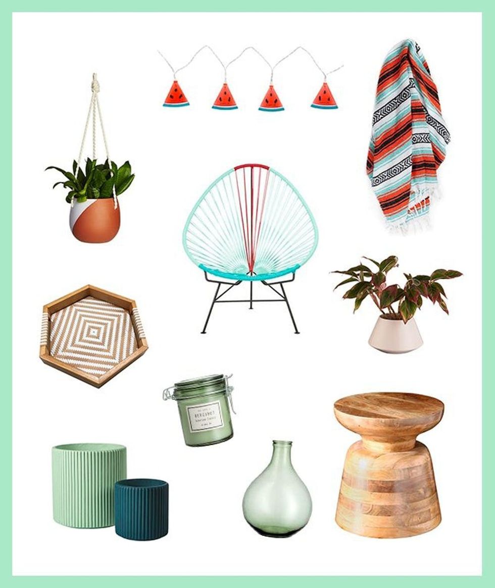 CB2 Cove Hanging Planters ($17+), Sunnylife Watermelon String Lights ($26), Gunn & Swain Cassidy Throw Blanket ($50), CB2 Roz Small Pink Planter ($18), Renwil Jamestown Accent Table ($328), H&M Small Glass Vase ($13), H&M Scented Candle in Bail-lid Jar ($10), CB2 Tahiti Cement Planters ($30+), Justina Blakeney Selva Tray ($149), CB2 Acapulco Aqua-Red Egg Outdoor Chair ($279)