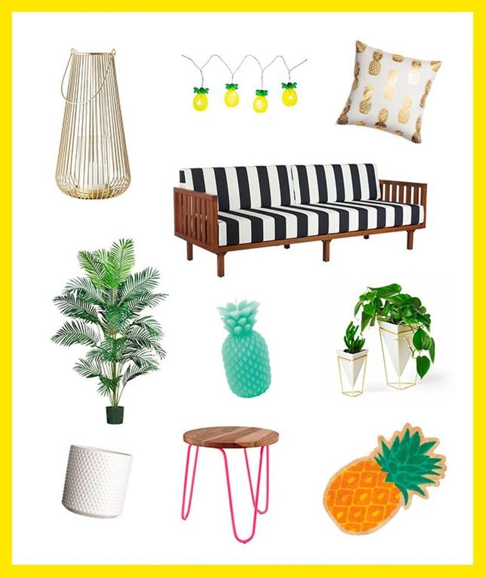 CB2 Swoon Hurricanes ($50+), Sunnylife Pineapple String Lights ($26), H&M Pineapple-Print Cushion Cover ($10), CB2 Tropez Black and White Stripe Sofa ($1129), Umbra Trigg Vase ($40, set of two), Sunnylife Pineapple Doormat ($35), Land of Nod Neon Nightstand ($179), H&M Stoneware Plant Pot ($13), Nearly Natural 7-Foot Paradise Palm ($86), Sunnylife Pineapple Candle ($28)