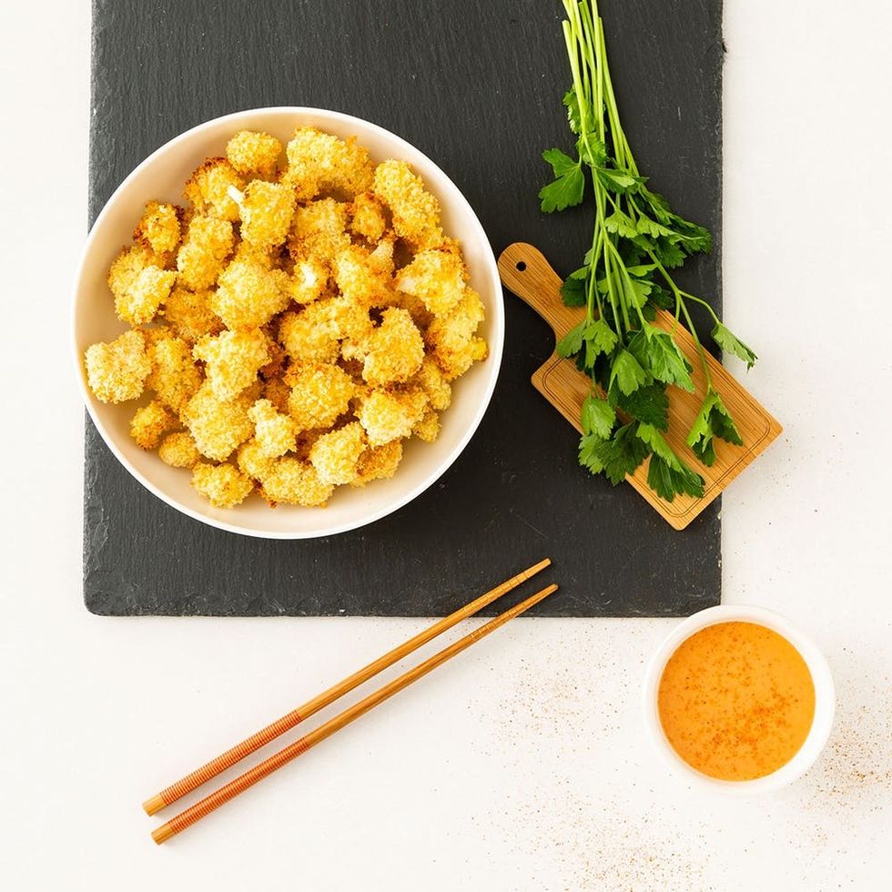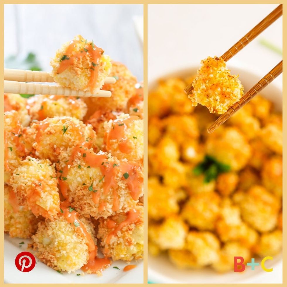 At first thought, we think her recipe is a riff on Bonefish Grill’s Bang Bang Shrimp. The chain restaurant is famous for its signature appetizer that features panko-coated shrimp served with a chili-mayo dipping sauce. The beloved app has inspired dozens of bloggers to come up with their own copycat versions, and Kirbie’s Cravings blogger Jennifer Lee has developed a solid vegetarian rendition. However, in an email Lee told Brit + Co, “The dish is inspired by my Chinese-American background. I love creating American twists on Chinese dishes.” As to why it’s so popular, Lee added, “It is a unique way to eat cauliflower (breaded and baked until crispy) and a healthier way to enjoy a bang bang sauce-flavored dish without sacrificing on taste or flavor.”