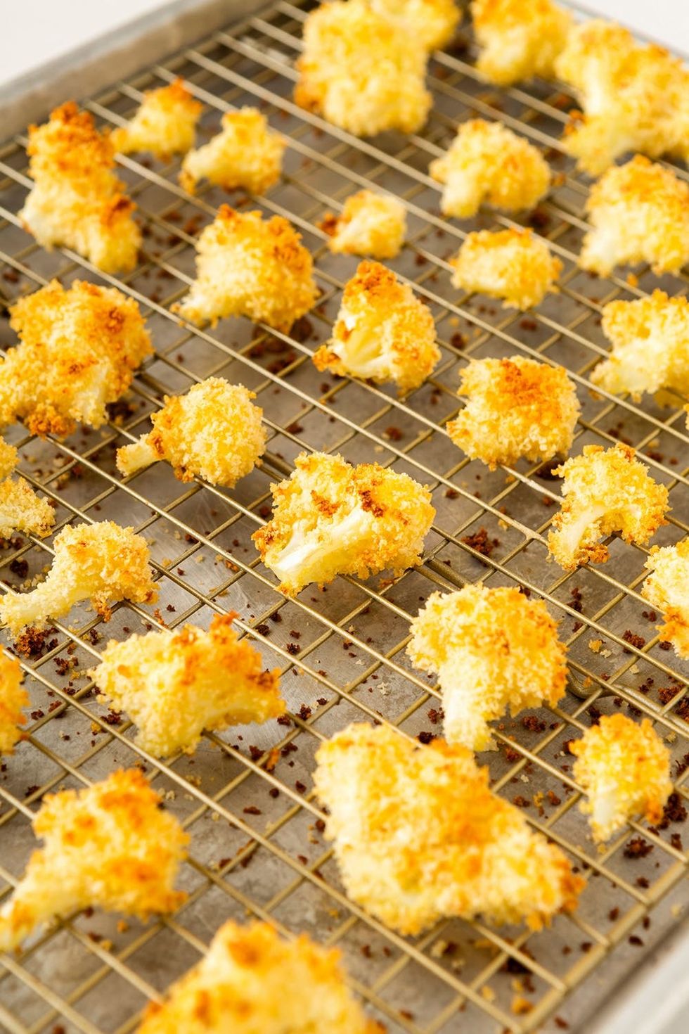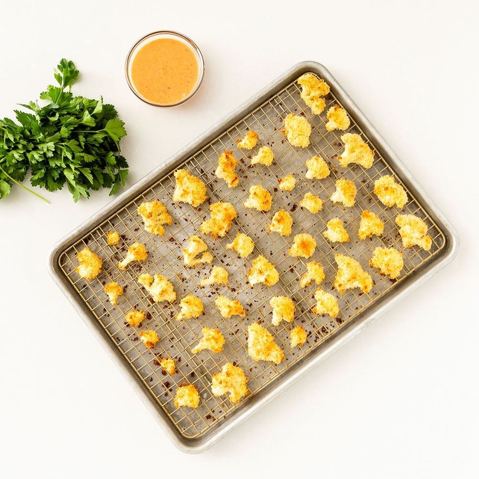 2. Dip cauliflower pieces in egg and then roll in panko until fully coated and then place on a baking sheet lined with parchment paper (we lined it with a cooling rack to maximize crispiness around all sides). You may need to use your fingers to press on the coating to help it to stick to the cauliflower bites. Repeat until all cauliflower is coated.