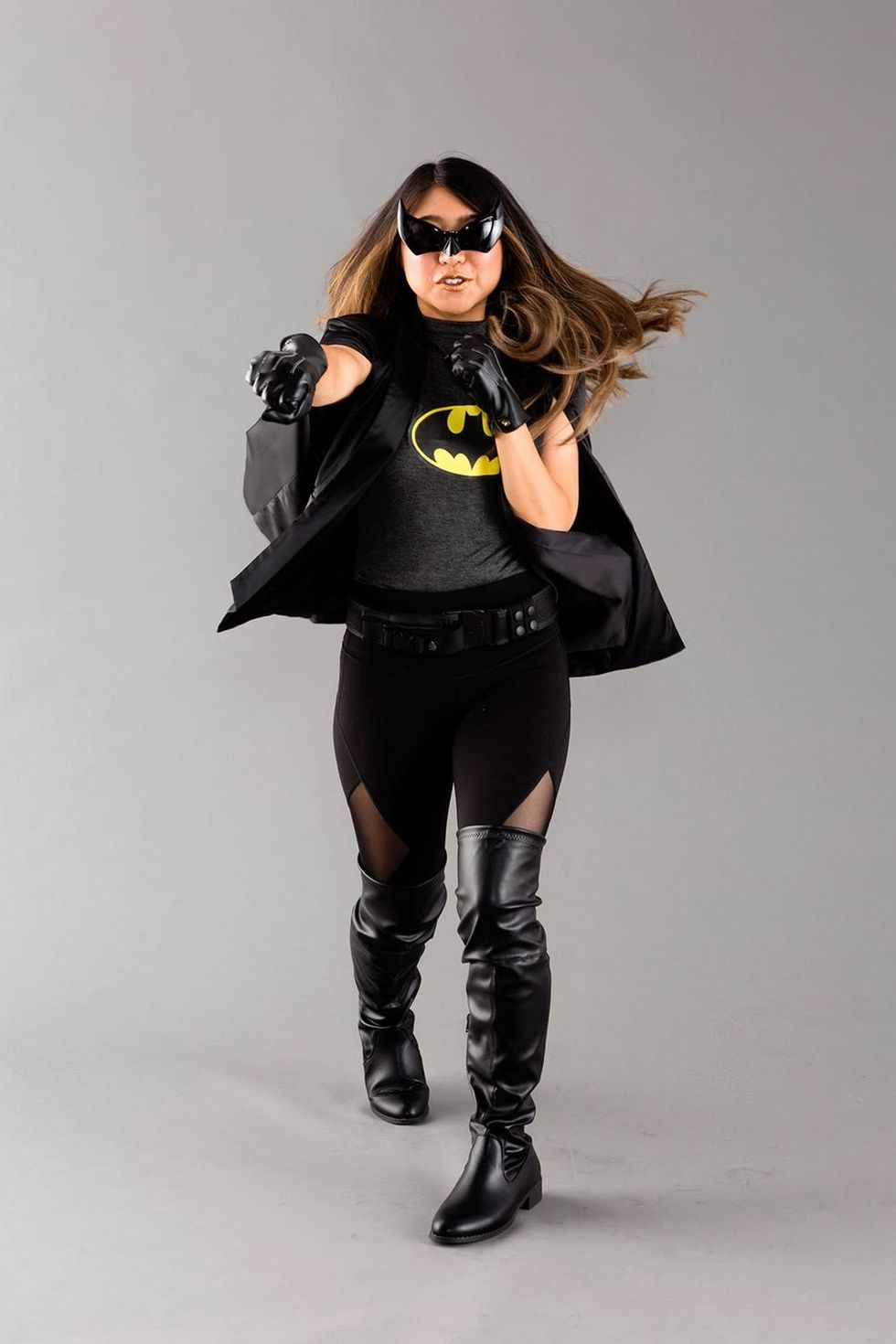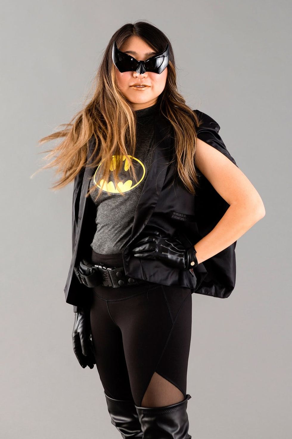 Batgirl’s outfit is just as accessible and fashion-forward! I dressed Visual Designer Torii in a Haoduoyi Cap Blazer ($21), ROF Over-the-Knee Boots ($30), and leather gloves ($9), all from Amazon. I picked up some black workout leggings with mesh cutouts and ironed on a Batgirl logo on a dark gray turtleneck. I topped off the look with a pair of Batman Sunglasses ($8) and slung a UTG Pistol Belt ($15), both from Amazon.