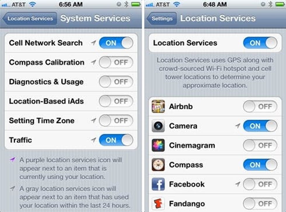 Location Services: Some apps really do help you out by knowing where you are, but some definitely don't need that information. Head to settings and turn off the location services part of apps like Fandango, Pinterest, Angry Birds (really?), and Shazam. When you're done with that, scroll down and head to System Services. Turn off things like compass calibration and setting time zone, unless you're traveling a LOT.