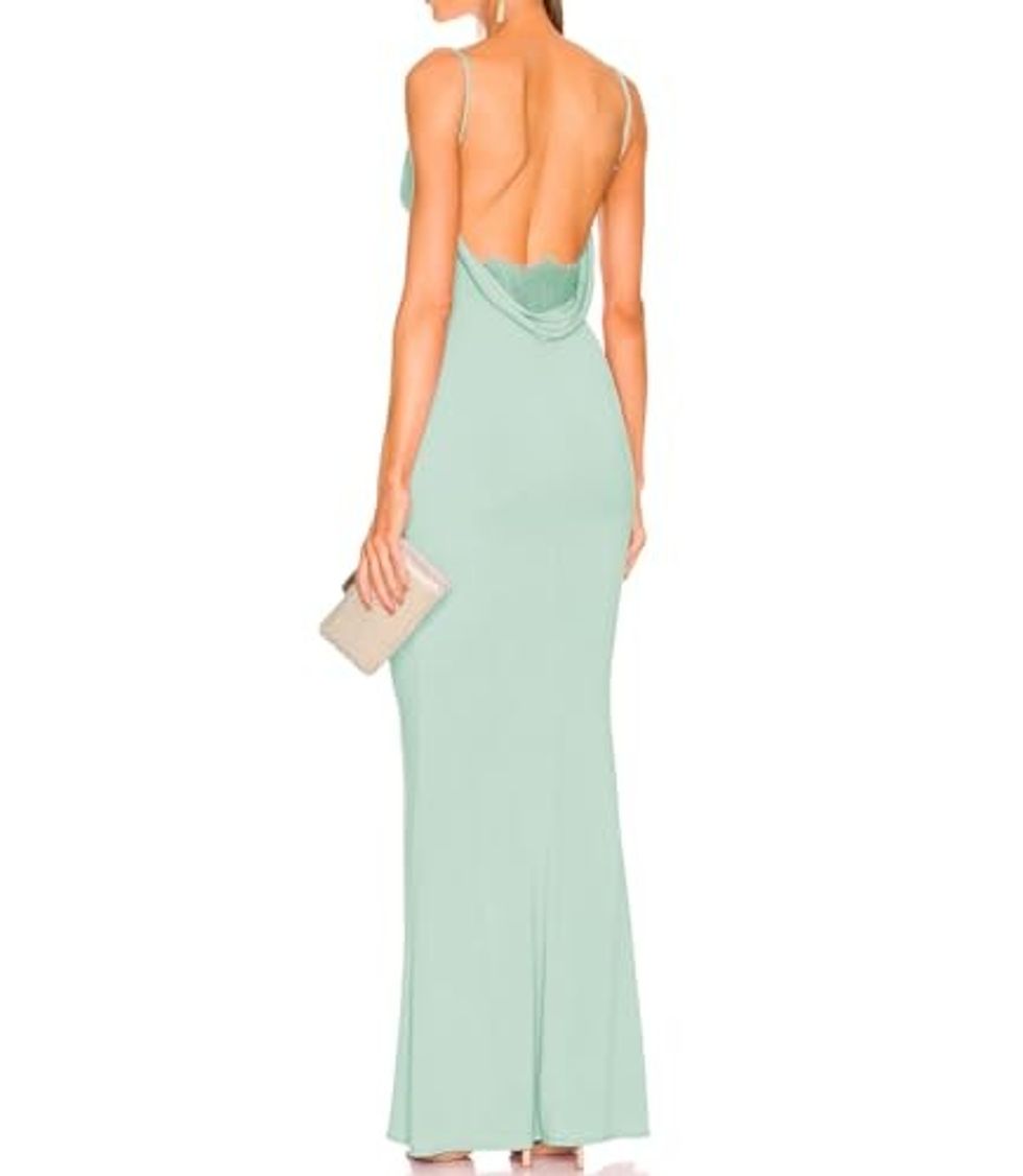 Spice up your formal wardrobe collection with this full-length gown. Its backless design with lace trim elevates your overall look, while the cowl neck in the front is super flattering on anyone. Striking a good balance between formal and semi-formal, it features spaghetti straps and a maxi skirt.