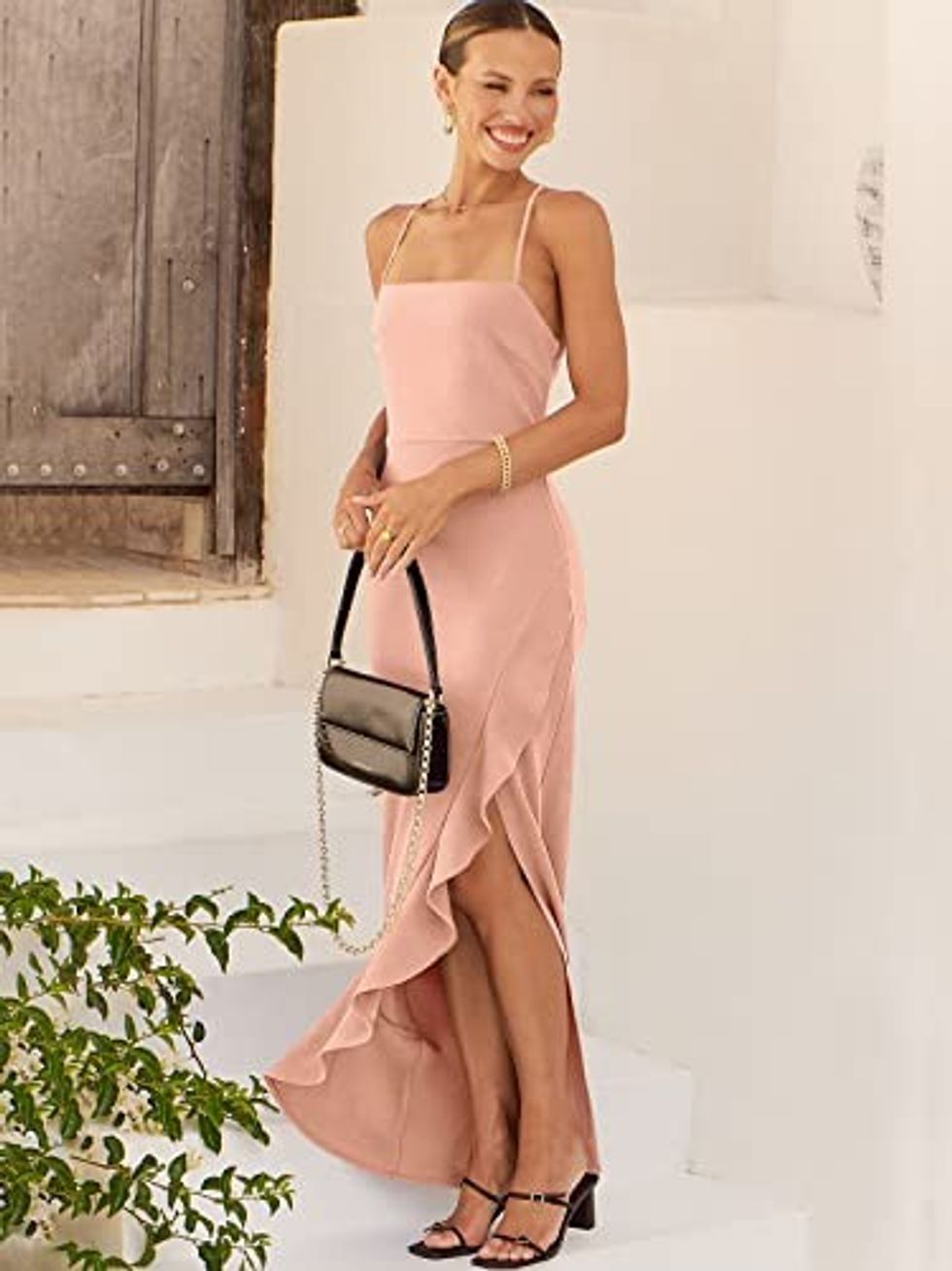 You can never go wrong with a simple maxi dress with elevated detailing like this one. It features a side slit that's accented with ruffles from top to bottom, giving it a more dramatic look and contrasting the simple top with just some spaghetti straps. This dress is perfect for showing off any fancy heels or flats.