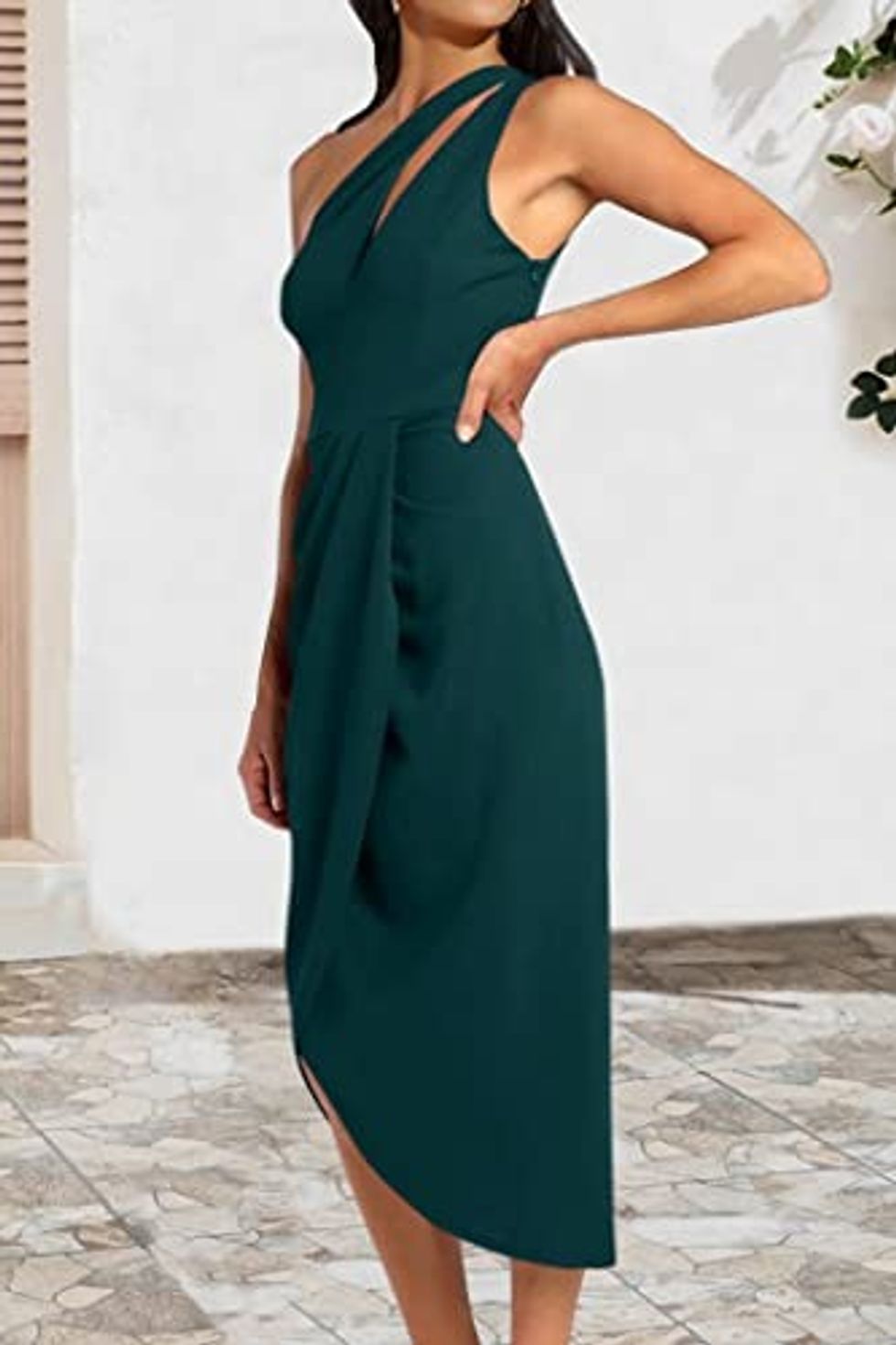 Sometimes, the weather isn't perfect for wearing a long dress without overheating throughout the event, and that's why this midi dress is the perfect solution. It features a formal design that will keep you within the dress code while providing a more comfortable feel. With a one-shoulder strap, a classy cutout, and a skirt that has a wrapped appearance, it's both stylish and practical.