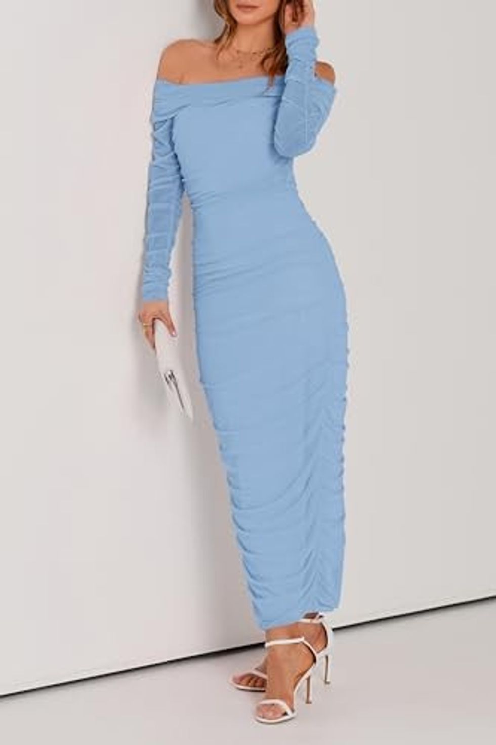 If you like a more fitted dress, this ruched bodycon dress will be an excellent choice. It features a simple pattern with busy detailing in a sheer fabric that gives it a ruched effect. With flattering off-the-shoulder sleeves, it leaves your shoulders and neck open, perfect for showcasing some gold jewelry.