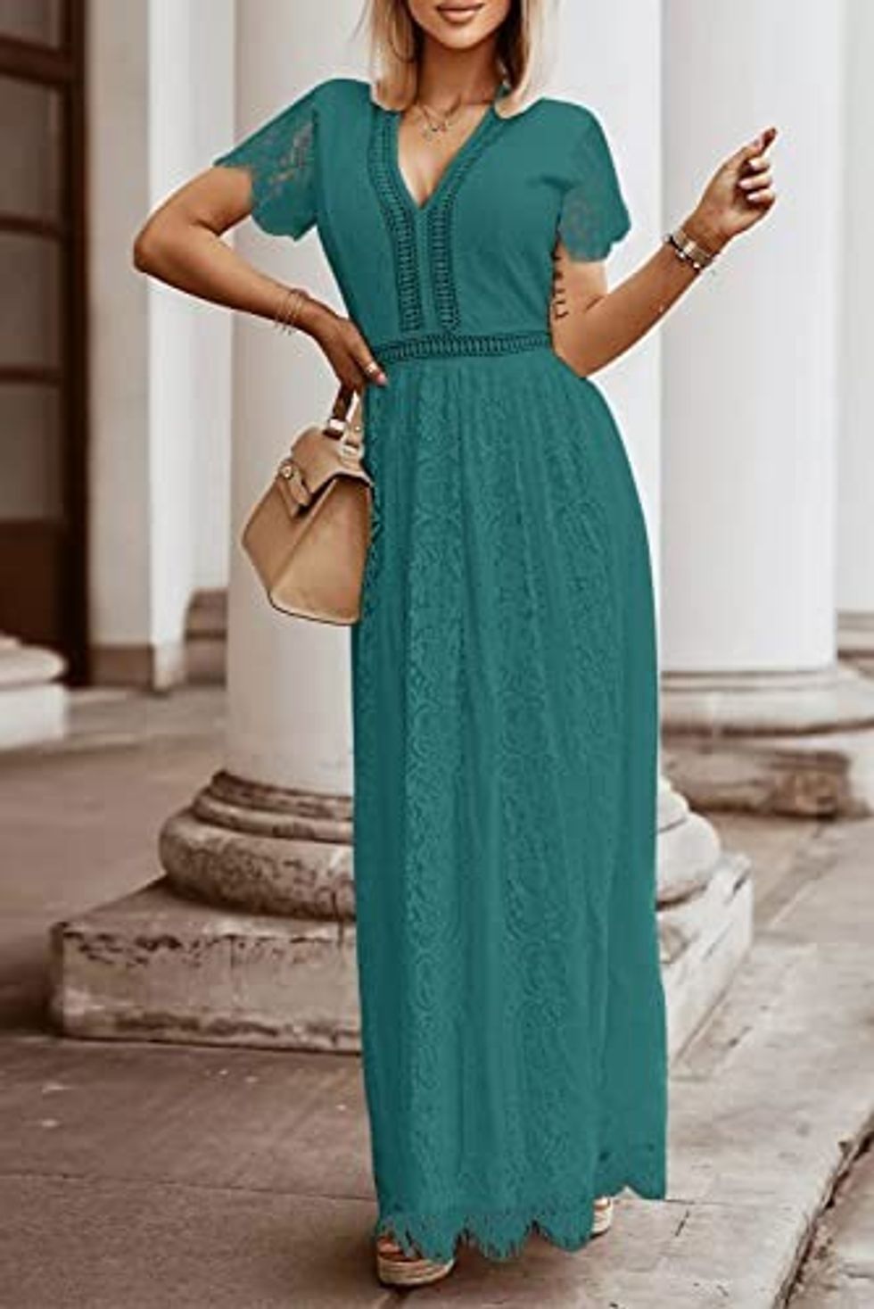 Nothing exudes elegance and grace for a summer wedding outfit like a lace dress. This stunning piece features a flattering V-neck and delicate short sleeves, adding a touch of sophistication to your ensemble. With its full-length skirt, it effortlessly blends into even the most strictly formal dress codes, ensuring you look picture-perfect for the occasion.