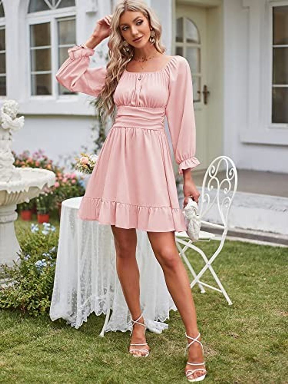 You can never go wrong with a lantern sleeve dress, especially during a daytime wedding. It boasts a short A-line skirt and a loose-fitting top that cinches together with a belt in the middle. This versatile option pairs well with layered necklaces or bold earrings, adding a touch of personal style to your ensemble.